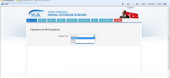 2- YAPILANDIRMA MENÜSÜNDEKİ ALT MENÜDEN "Yapılandırma - 4B" LİNKİNE TIKLANARAK PRİM VEYA SGDP SEÇİLEREK 'YAPILANDIRMA SORGULA' BUTONUNA BASILIR.