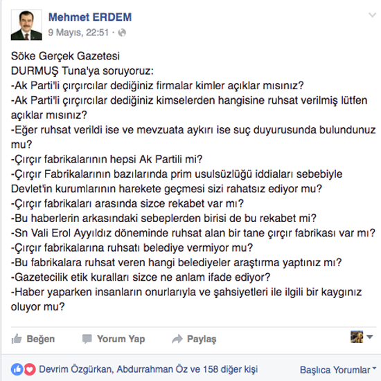 AKP Aydın Milletvekili Mehmet Erdem’im şahsıma yönelik bir dizi sorusu olmuştu ve dünden itibaren cevaplandırmaya başlamıştım.