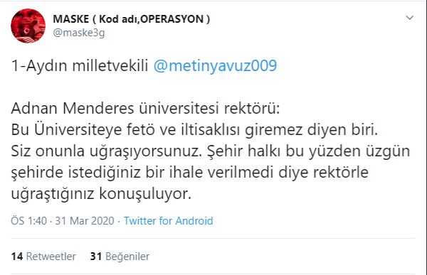 MASKE’de; “AK Parti Aydın Milletvekili Metin Yavuz Adnan Menderes Üniversitesi’nden istediği ihaleye alamadığını ve bu nedenle ADÜ Rektörü Osman Selçuk Aldemir’i hedef tahtasına koydu” şeklinde paylaşım yapıldı.